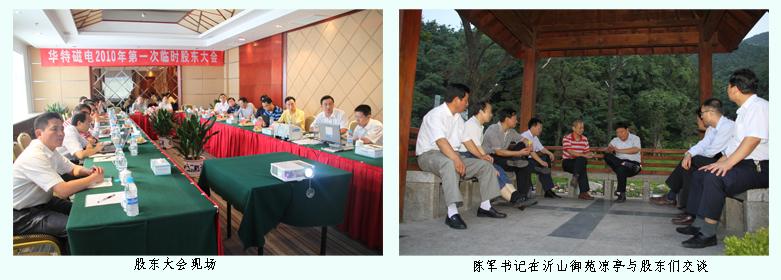 7月25日上午,在沂山東鎮(zhèn)御苑酒店四樓會議室召開華特磁電2010年第一次臨時股東大會。公司的8位法人股東、8位自然人股東出席本次會議,代表公司4500萬股,占公司股本的100%。會議由公司董事長王兆連先生主持,公司職工董事、監(jiān)事及部分核心高管列席了會議。