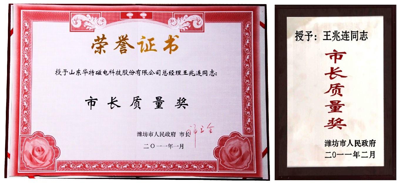 公司董事長兼總經理王兆連榮獲“2010年度濰坊市市長質量