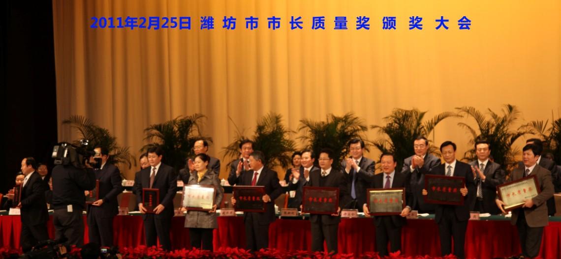 2月25日,在濰坊召開的市長質量度獎頒獎大會上,公司董事長兼總經理榮獲“2010年度濰坊市市長質量獎”。這是濰坊市最高質量獎項。王兆連董事長帶領企業積極推行卓越績效評價準則等先進質量管理方法,倡導創建有特色的企業質量文化,強化技術創新體系建設,推動降低消耗、利用資源、保護環境,實現了質量效益和可持續發展。