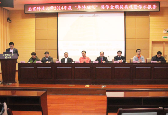 初冬時(shí)節(jié),北京科技大學(xué)圖書館四樓報(bào)告廳暖意融融,2014年度“華特磁電”獎(jiǎng)學(xué)金頒獎(jiǎng)典禮暨學(xué)術(shù)報(bào)告會(huì)于12月8日下午在此隆重舉行。公司董事長(zhǎng)兼總裁王兆連、公司常務(wù)副總劉風(fēng)亮、北京科技大學(xué)土木與環(huán)境工程學(xué)院常委書記金龍哲、礦物加工工程系書記孫體昌等公司和學(xué)院領(lǐng)導(dǎo)師生100余人出席活動(dòng)。