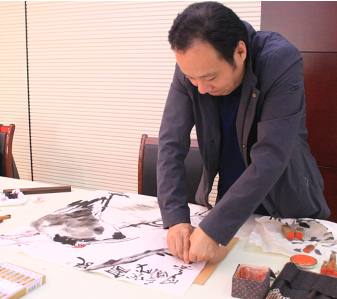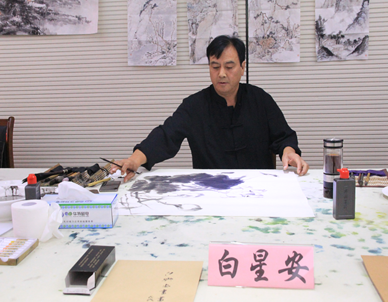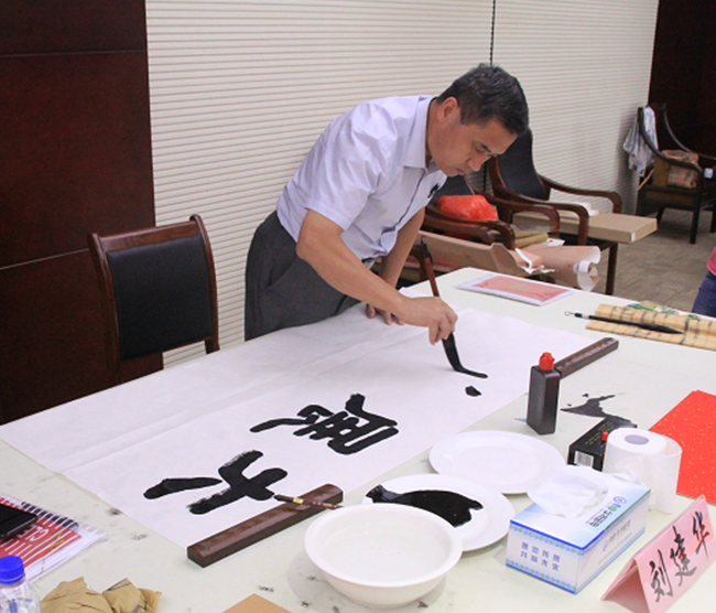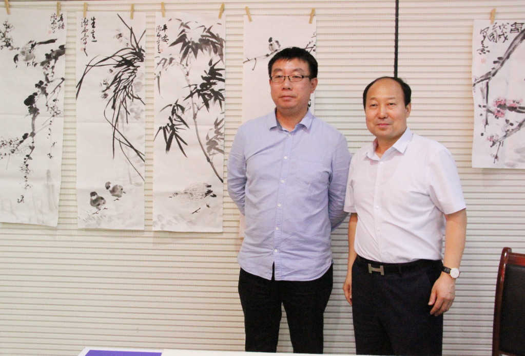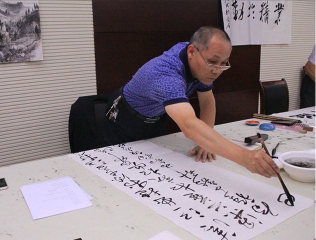 短暫的座談會后,畫家們來到了公司二樓多功能大廳開始了書畫創作。臨朐美術名家參加活動的有:傅立、白星安、王法生、姜會信、王春國;臨朐書法名家參加活動的有:張頤人、宋智利、劉建華、周世民、楊文梁。老師們書畫創作的熱情高漲,一直創作到下午1:00才收筆。