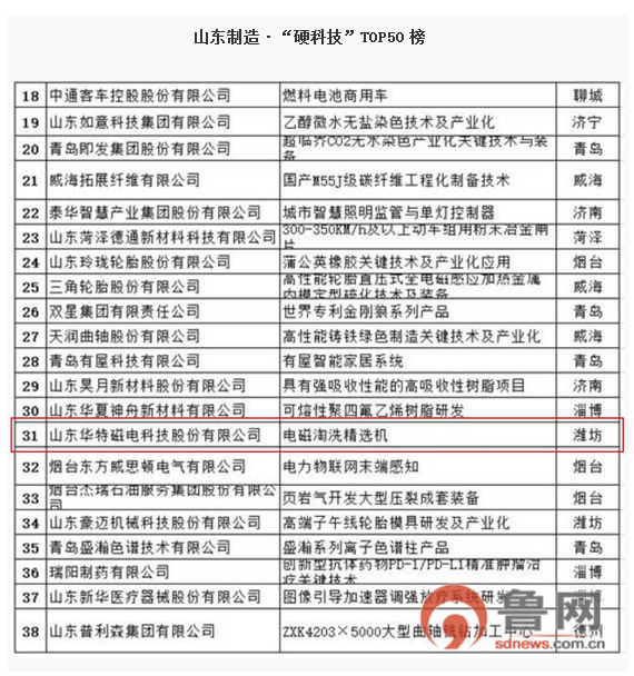 2019年5月23日上午,以“科技鑄就品牌之魂 創(chuàng)新推動高端發(fā)展”為主題的制造業(yè)高質(zhì)量發(fā)展2019山東論壇暨山東制造?硬科技TOP50品牌榜發(fā)布儀式在濟(jì)南市南郊賓館舉行。華特公司“電磁淘洗精選機(jī)”產(chǎn)品成功入圍“2019山東制造?硬科技Top50品牌榜”,公司常務(wù)副總劉風(fēng)亮出席會議并領(lǐng)取獎杯。